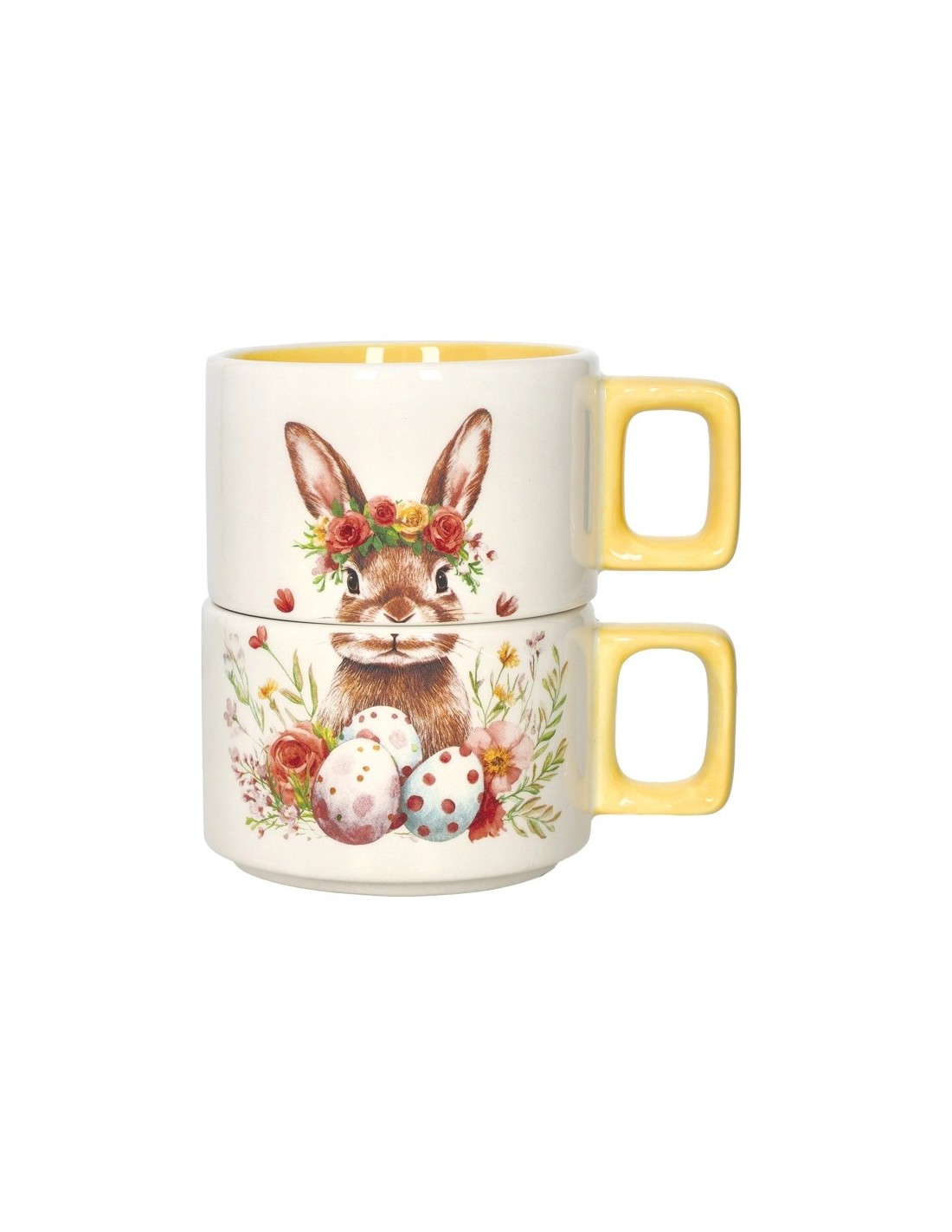 Realizzata in resistente stoneware - materiale affidabile per durezza ed altresì elegante - la tazza Happy Rabbit si compone di un elegante set da due pezzi comodamente impilabili (dunque salvaspazio) con manico ed interno di gialla tonalità.