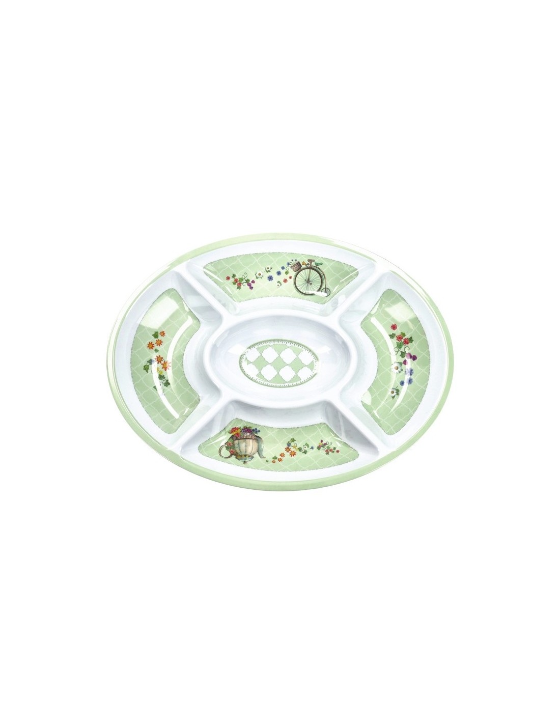 Antipastiera ovale in melamina, in stile Wonderland. La forma allungata e divisa in sezioni è pensata per servire antipasti, stuzzichini o assortimenti da condividere in modo pratico e ordinato.
