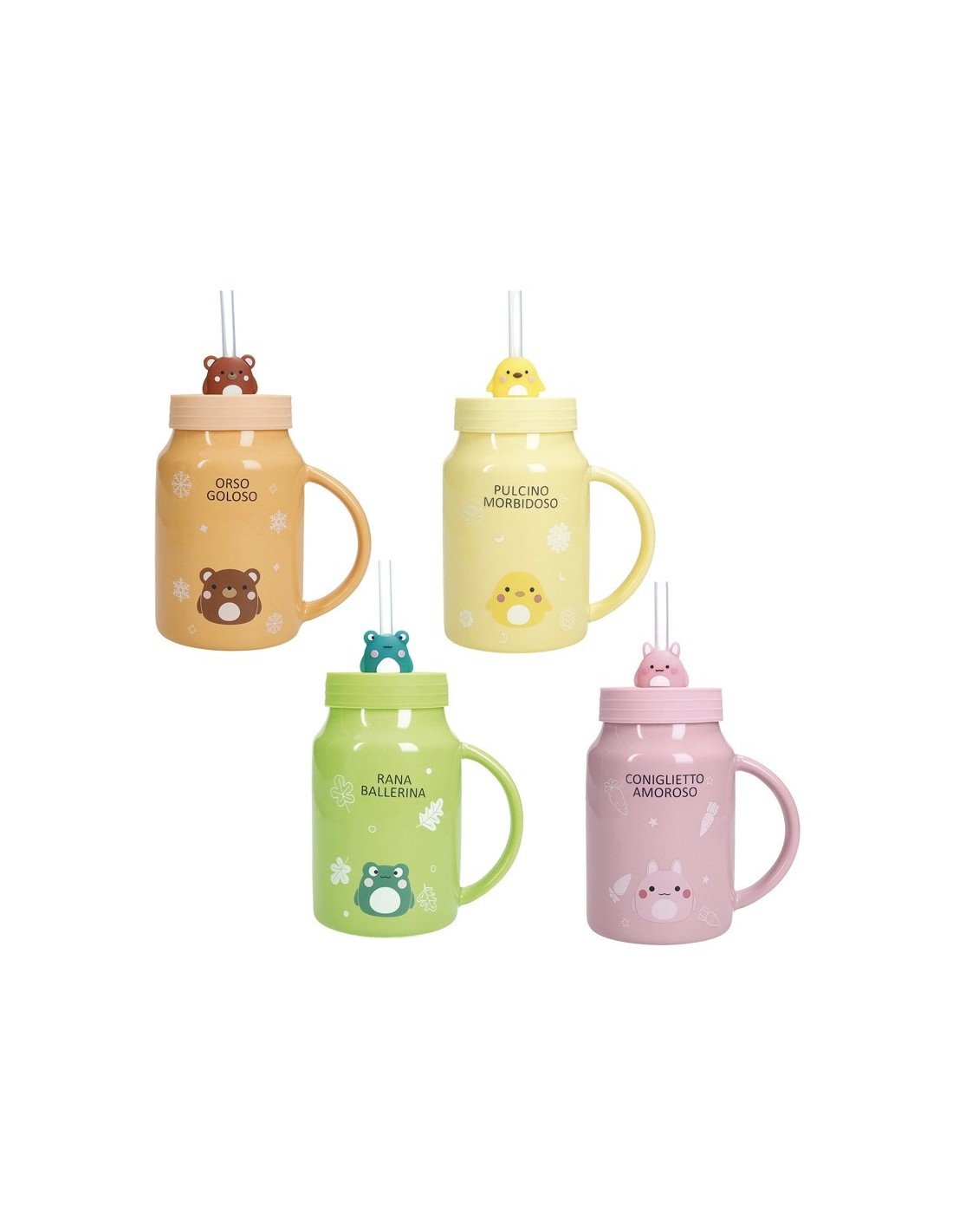 Un'allegra banda di amici pronta a diffondere allegria! Scegli la tua mug preferita: orso goloso, pulcino morbidoso, rana ballerina o coniglietto amoroso? Ogni mug Amico Mio firmata Brandani è dotata di comodo manico, pratico tappo per proteggere le tue bevande ed una divertentissima cannuccia dove simpatici animaletti fanno capolino.